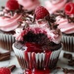 These Amazing Raspberry Chocolate Lava Cupcakes feature a moist chocolate cake filled with a gooey raspberry preserves center, topped with a luscious raspberry buttercream and garnished with fresh raspberries and dark chocolate shavings. Perfect for chocolate lovers craving a burst of fruity freshness in every bite.