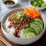 This Asian Ground Turkey and Rice Bowl is a quick, flavorful meal perfect for busy weeknights. Combining savory turkey with fragrant ginger and garlic, it’s served over fluffy white rice and topped with fresh cilantro and pickled vegetables for a satisfying bite every time.