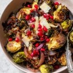 - Serve and Garnish: Transfer the roasted Brussels sprouts to a serving platter. Sprinkle generously with freshly grated Parmigiano-Reggiano and scatter pomegranate arils on top to add brightness and color. Drizzle the reserved glaze if desired and serve warm.
