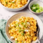 - Mix in Cheeses and Green Onions: Remove the lid and fluff the rice with a fork. Stir in the shredded cheddar cheese, crumbled blue cheese, and chopped green onions. Adjust seasoning with additional salt and pepper to taste, then serve hot.