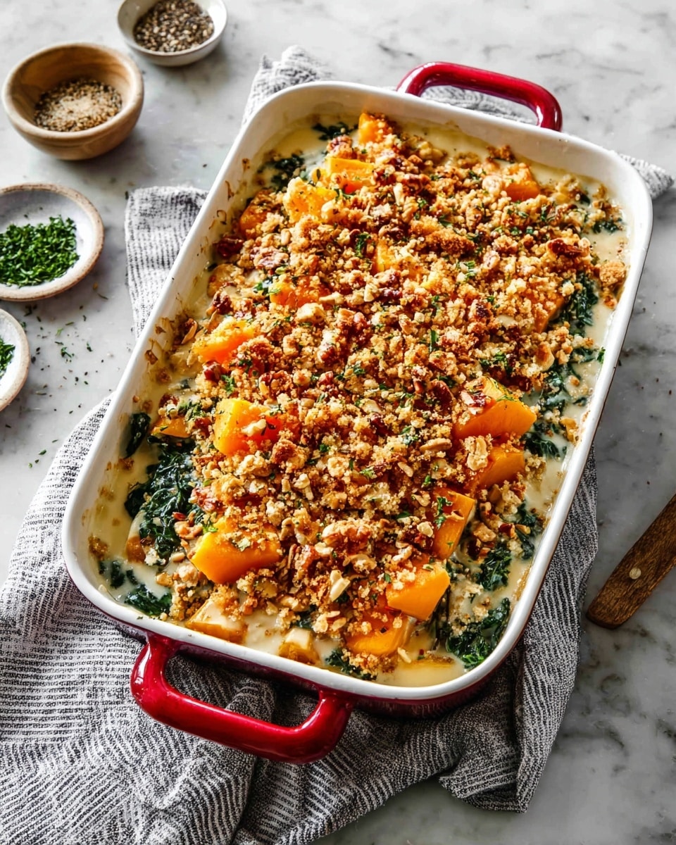 This Cheesy Butternut Squash Casserole features creamy roasted butternut squash and sautéed kale in a rich cheesy filling, topped with a crispy Parmesan and walnut sourdough crust. Perfectly balancing sweet, savory, and crunchy textures, this dish is an elegant and nutritious holiday side or comforting vegetarian main.