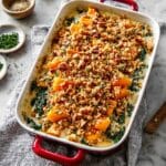 This Cheesy Butternut Squash Casserole features creamy roasted butternut squash and sautéed kale in a rich cheesy filling, topped with a crispy Parmesan and walnut sourdough crust. Perfectly balancing sweet, savory, and crunchy textures, this dish is an elegant and nutritious holiday side or comforting vegetarian main.