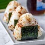 Store leftover onigiri in an airtight container in the refrigerator for up to 1 day. For the best texture, reheat gently in the microwave wrapped in a damp paper towel, then add fresh nori before serving. Avoid storing wrapped in nori to keep it crisp.