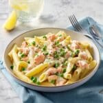 A luscious and comforting creamy hot smoked salmon pasta recipe featuring tender pasta tossed in a delicate sauce of crème fraîche, white wine, lemon, and fresh dill, complemented by sweet peas and smoky salmon. Perfect for a quick yet elegant weeknight dinner.