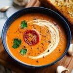 This creamy roasted garlic tomato soup combines the rich, caramelized flavors of oven-roasted tomatoes and garlic with fresh basil and a touch of cream for a comforting, velvety smooth dish perfect for any season.