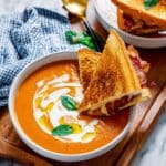 - Serve: Ladle the creamy tomato bisque into bowls. Garnish with a drizzle of olive oil, an extra splash of heavy cream, and a sprinkle of fresh basil for a beautiful finish. Enjoy with your favorite sandwiches like a Bacon Grilled Cheese or Chicken Grilled Cheese!