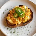 This Crispy Egg Salad recipe offers a delightful twist on the classic egg salad by pan-frying a mixture of chopped hard-boiled eggs, mozzarella cheese, mayonnaise, sriracha, and chives to create crispy, cheesy patties. Served on toasted bread with avocado and jalapeño slices, it delivers a creamy, spicy, and flavorful meal perfect for breakfast, lunch, or a light dinner.