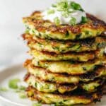 - Serve: Serve the zucchini fritters immediately with a dollop of yogurt or sour cream and garnish with extra chopped green onions if desired.
