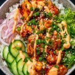 This Easy Bang Bang Chicken Bowl features crispy, flavorful chicken coated in a seasoned cornstarch mixture and fried to golden perfection. Served over a bed of fragrant jasmine rice with fresh shredded lettuce, cucumber, carrots, and green onions, it’s topped with a creamy, spicy mayo sauce made from mayonnaise, sweet chili sauce, and sriracha. A quick and versatile dish perfect for a satisfying lunch or dinner, with options to substitute chicken with shrimp or tofu and jasmine rice with brown rice or quinoa.