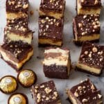 These Ferrero Rocher Cheesecake Bars combine rich Nutella, fudgy brownie, creamy cheesecake, and crunchy hazelnut chocolate topping for an irresistible dessert. Perfect for special occasions or anytime you crave a decadent treat.