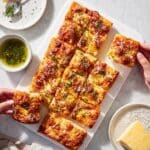 This Flaky Puff Crust Pizza features a buttery, laminated dough that creates a beautifully crisp and flaky crust, topped with a rich blend of pizza and Parmesan cheeses, a fresh tomato sauce, and finished with a flavorful garlic-basil oil drizzle. The multilayered dough technique gives the pizza a unique lightness and texture, making it a delightful homemade pizza experience.
