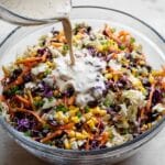 - Combine Salad Ingredients: In a large bowl, add the coleslaw mix, black beans, corn, jalapeño, red bell pepper, green onions, cilantro, taco seasoning, and ground cumin. Toss all the ingredients together thoroughly until well combined.