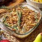 Keywords: green bean casserole, homemade green bean casserole, mushroom casserole, holiday side dish, crispy onion straws, baked green beans