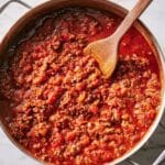 This homemade spaghetti sauce features a rich blend of sautéed onions, garlic, ground beef, and whole peeled tomatoes simmered slowly with herbs and finished with fresh basil and butter for a glossy, flavorful finish. Perfect for enhancing any pasta dish with a classic Italian-inspired taste.