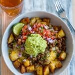 Keywords: potato taco bowl, loaded potato bowl, Mexican taco bowl, ground beef recipe, oven baked potatoes, air fryer potatoes, guacamole bowl, taco bowl recipe