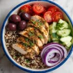 Mediterranean Chicken Bowls feature tender, marinated chicken served over a base of fluffy quinoa or brown rice, topped with fresh cucumbers, tomatoes, red onions, Kalamata olives, and crumbled feta cheese. This dish offers a delicious balance of protein, fiber, and healthy fats, bursting with vibrant Mediterranean flavors and a zesty lemon oregano dressing.