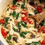 This Mediterranean Chicken Orzo is a vibrant, flavorful one-pot meal that features tender shredded chicken, fresh spinach, tangy feta cheese, and a medley of Mediterranean ingredients like Kalamata olives, capers, and cherry tomatoes, all simmered together with orzo pasta in a light white wine and chicken broth sauce. Perfect for a comforting yet healthy dinner that comes together quickly on the stovetop.