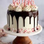 - Decorate and Serve: Frost cake with a final thick layer of peppermint buttercream. Warm reserved ganache to drizzle down sides. Optionally pipe rosettes with a star tip around the top. Allow cake to come to room temperature before serving and decorate with mini candy canes. Enjoy the cake best at room temperature.
