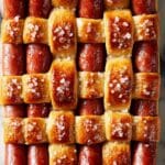 Pigs In A Quilt is a fun and visually striking appetizer featuring all-beef hot dogs wrapped in a woven crescent roll dough lattice, baked to a golden brown perfection and sprinkled with flaky sea salt. This crowd-pleasing snack combines flaky pastry with savory hot dogs, making it perfect for parties or casual gatherings.