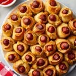 Pull-Apart Pigs In A Blanket is a fun and delicious appetizer featuring tender cocktail weiners wrapped in seasoned pizza dough, baked to golden perfection in a springform pan. Perfect for parties and gatherings, these bite-sized treats are served warm with a variety of dipping sauces like marinara, mustard, and ranch dressing.