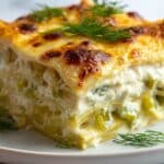 This Rich Dill Pickle Lasagna is a unique and savory twist on the traditional Italian classic. Layered with a creamy cheddar cheese sauce, tangy dill pickle brine, fresh dill, and plenty of pickle chips, this dish combines sharp, creamy, and tangy flavors for an unforgettable comfort food experience. Perfect for adventurous eaters who love bold flavors, it uses oven-ready lasagna noodles for convenience and is baked to golden, bubbly perfection.