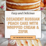 Keywords: Russian Peach Cake, layered peach dessert, almond sponge cake, peach preserves, whipped cream dessert, zefir topping, elegant fruit cake