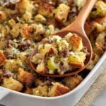 - Transfer and Bake: Grease a baking dish with butter or cooking spray. Transfer the stuffing mixture into the dish and spread it out evenly. Bake in the preheated oven for 30 to 40 minutes until the top is golden brown and crispy.