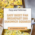 This Sheet Pan Breakfast Egg Sandwich is a simple and delicious recipe perfect for busy mornings. Eggs baked with ham, green peppers, chives, and melted Mexican cheese create a flavorful and protein-packed breakfast that can be conveniently sliced and served on toasted and buttered English muffins.