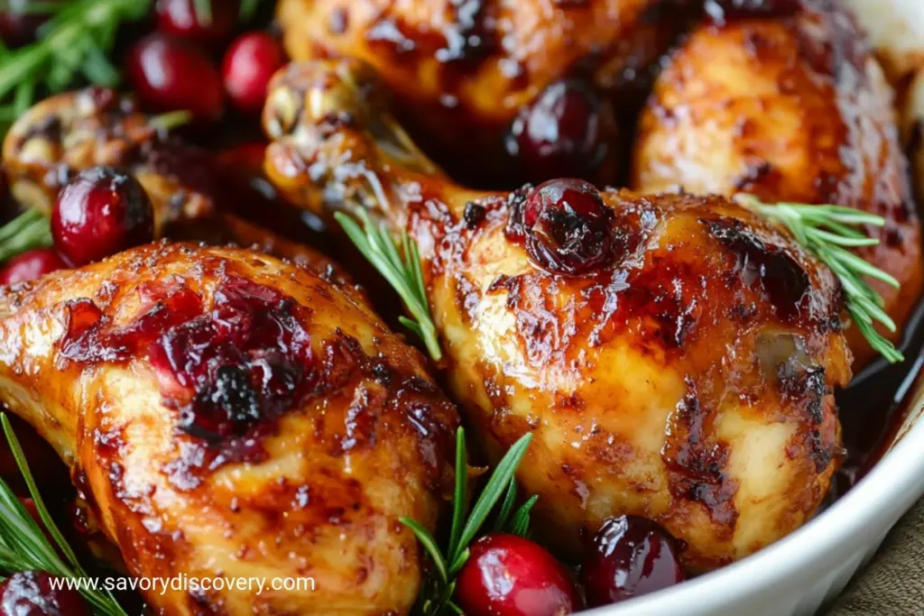 Once the chicken pieces are seared to perfection, pour the prepared glaze generously over them. Sprinkle fresh or frozen cranberries atop the chicken and add a few fresh thyme sprigs for a beautiful presentation and additional flavor. Carefully transfer the skillet to the preheated oven and bake for 35-40 minutes. Keep an eye on the chicken to ensure it cooks thoroughly and reaches an internal temperature of 165°F (75°C). If any liquid remains after baking, drain it off before serving to maintain a beautiful glaze.