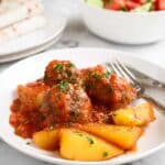 Keywords: Soutzoukakia, Greek meatballs, baked meatballs, potato wedges, tomato sauce, Greek cuisine, oven-baked