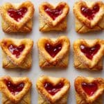 - Step 2: Place a very small dollop of strawberry jam in the center of each diamond. Fold the corners of the longer sides toward the center, then fold the remaining corner to meet in the middle, creating an open envelope shape. Press down lightly to seal. Use a small heart-shaped cookie cutter to cut hearts from the remaining dough and place one heart in the center of each envelope.