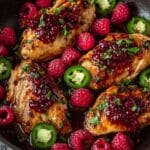 Enjoy a vibrant and flavorful Sweet and Spicy Jalapeno Raspberry Chicken, featuring juicy seared chicken thighs glazed with a luscious raspberry and spice sauce. This quick and easy recipe combines a sweet and tangy raspberry preserves glaze with a spicy kick from jalapenos and chili powder, all cooked perfectly on the stovetop in just 25 minutes.