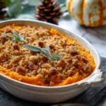 Keywords: sweet potato casserole, Thanksgiving side dish, holiday recipe, sweet potatoes, pecan topping, marshmallows, make ahead casserole