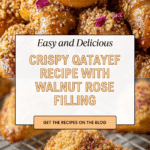 Keywords: Qatayef, Middle Eastern dessert, fried pancakes, walnut filling, sugar syrup, honey lemon syrup, rose water, traditional dessert