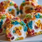 Keywords: Fruity Pebbles sushi, marshmallow cereal treats, no bake dessert, colorful cereal roll, kids dessert, candy sushi