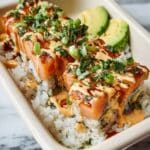 - Step 4: Add Toppings: Remove the dish carefully from the oven. Top the salmon layer with cubed avocado, drizzle with spicy mayo, and sprinkle furikake, crispy fried onions, and finely diced scallions for a colorful and flavorful finish.